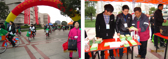 本次活動以公共自行車為載體,意在積極倡導(dǎo)低碳消費的出行理念。為了做好環(huán)城騎行宣傳活動的車輛保障,公共自行車管理部提前制定活動實施方案,完成對活動車輛安全性能方面的檢查、調(diào)試和清潔工作,合理配置人員、責(zé)任落實到位,全力以赴、做好準(zhǔn)備?;顒赢?dāng)天,由部門負(fù)責(zé)人現(xiàn)場管理指導(dǎo),工作人員從清晨7點開始將55輛活動用公共自行車(包括5輛應(yīng)急準(zhǔn)備車輛)調(diào)運至人民廣場指定地點,并對車輛進(jìn)行最后的排放、檢查、核對、登記、維持秩序等工作,保障活動順利開展。另一方面,志愿者們在活動主會場設(shè)立公共自行車宣傳服務(wù)臺,耐心解答市民提問,廣泛聽取市民意見和建議,發(fā)放宣傳手冊500余份,將公共自行車的優(yōu)質(zhì)服務(wù)切近市民,大力宣傳“低碳環(huán)保,綠色出行”的環(huán)保理念。